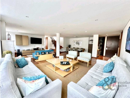 Cuatro habitaciones, cada una con baño, sala,chimenea, comedor independiente, estar, cocina, zona de lavandería y cuarto Y con baño de servicio 3 parqueaderos.
